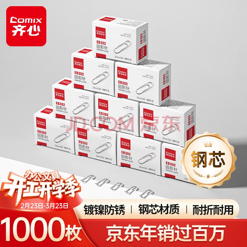 齐心(COMIX)【超级爆款】1000枚29mm镀镍回形针/曲别针3#镀镍防锈100枚/盒10盒装EB302