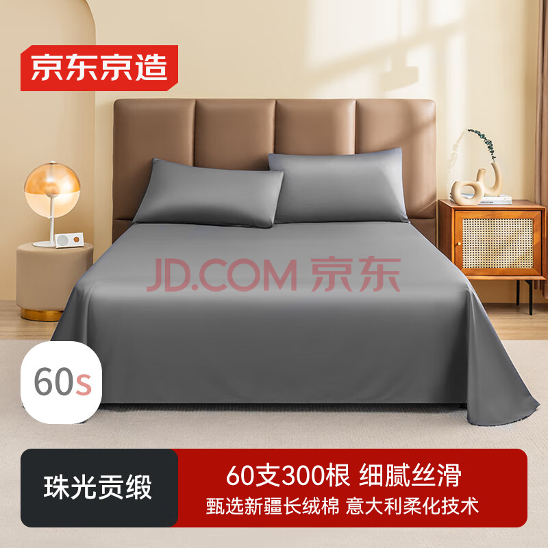 京东京造 60支长绒棉贡缎床单 A类纯棉床盖全棉床单单件 245x270cm 雪灰