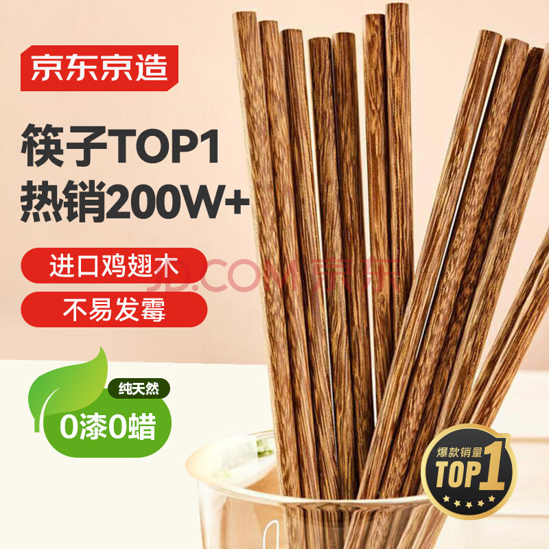京东京造 筷子 家用食品接触级餐具实木防滑鸡翅木原木【无漆无蜡】10双装