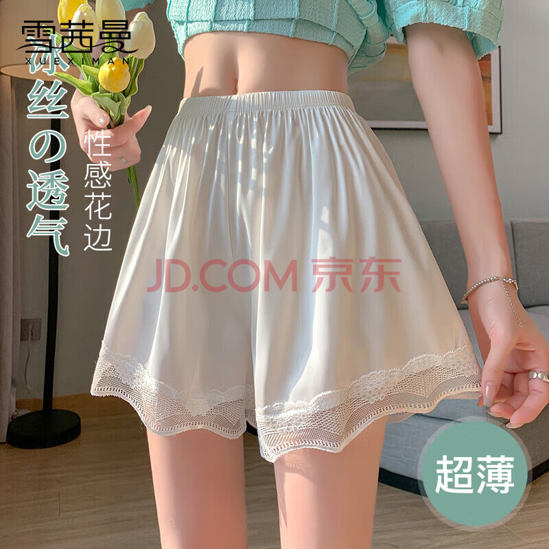 雪茜曼防走光安全裤女冰丝宽松不卷边打底裤大码蕾丝边保险裤 白色 L