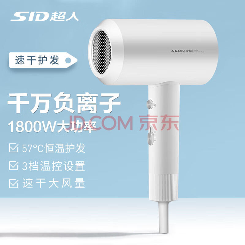 超人(SID)电吹风 负离子护发 1800W大功率 家用吹风机恒温大风量速干 三档风温两档风速 RD72030 白色