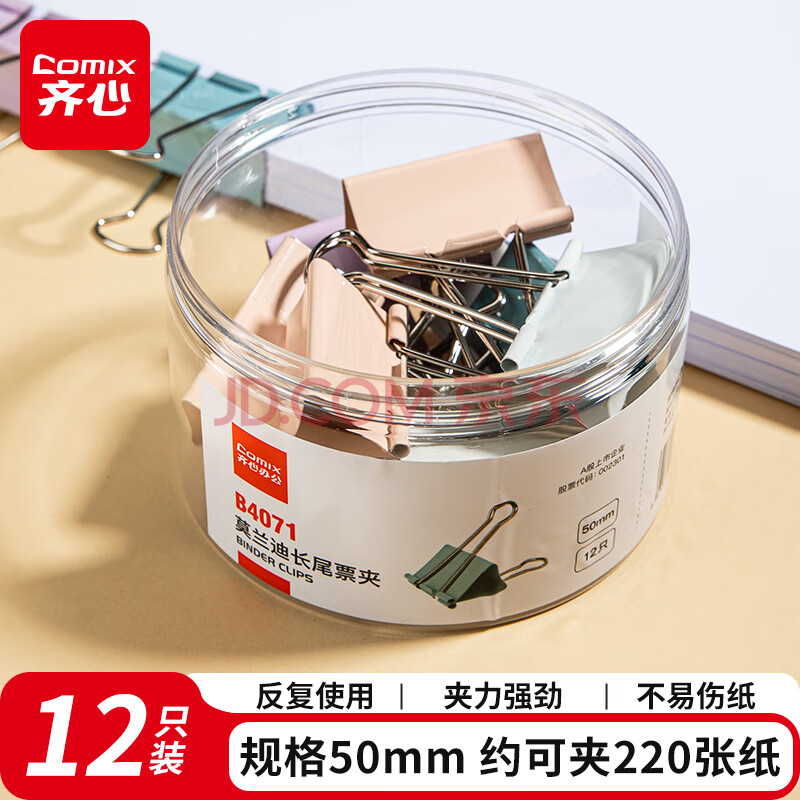 齐心(COMIX)省力长尾夹12只 50mm文具文件夹子1#燕尾夹莫兰迪彩色 B4071