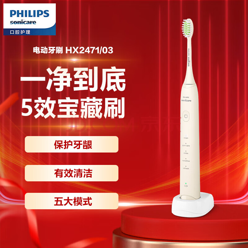 飞利浦电动牙刷成人情侣款 清洁干净软毛柔和亮白刷头5效宝藏刷 瑞斯白HX2471/03