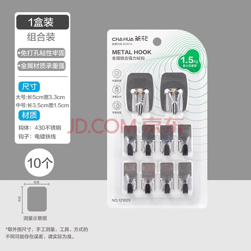 茶花 121029不锈钢挂钩 免打孔强力粘钩挂墙壁 无痕钩宿舍墙面粘贴钩子 10只装/包 1包(单位:包)