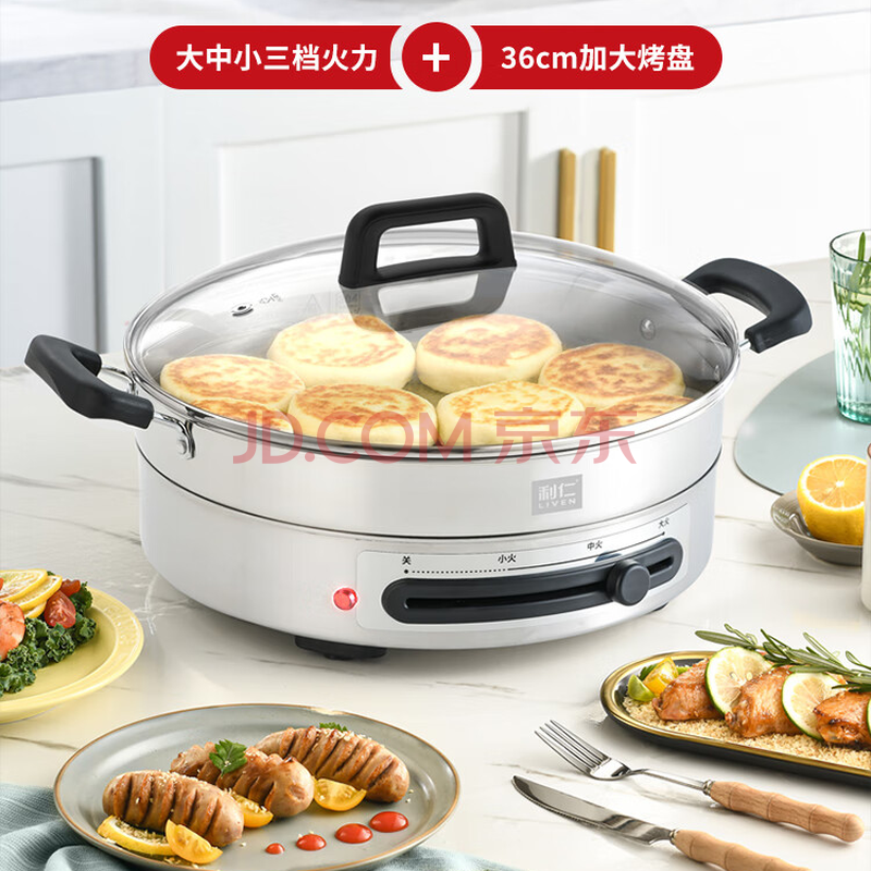 利仁(Liven)电饼铛家用电煎锅304不锈钢0涂层电饼档36cm加大煎饼锅煎烤机烙饼锅55mm加深 DJG-J3633