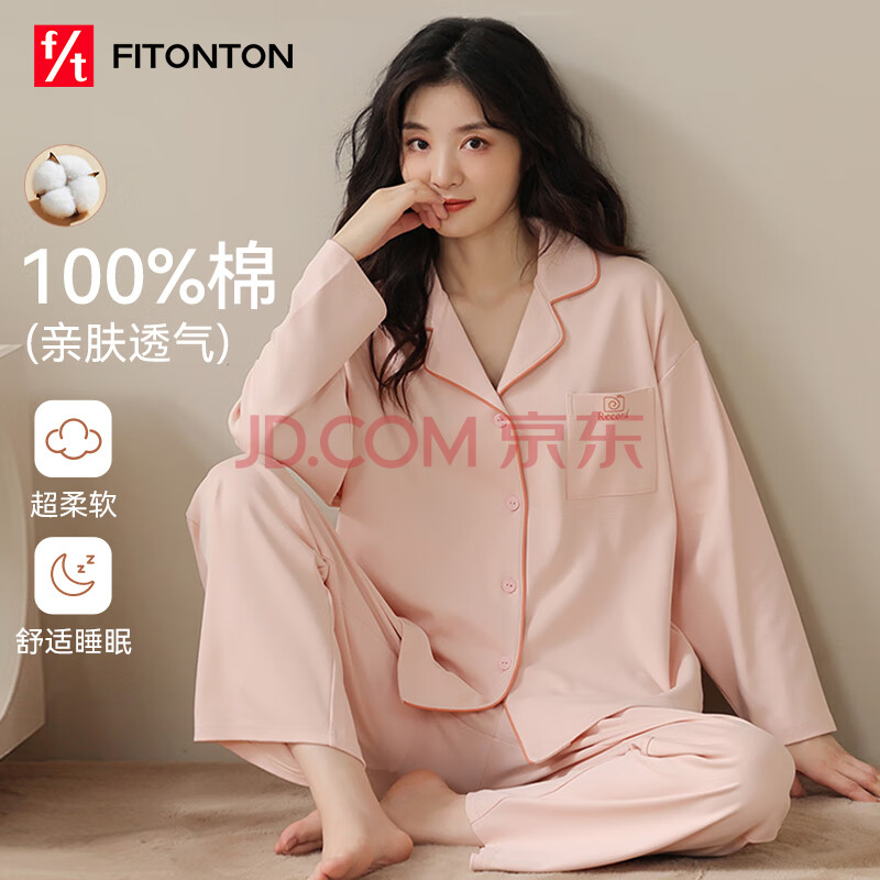 FitonTon女士睡衣女软绵绵秋冬纯棉抑菌防螨长袖翻领开衫可外穿女神节XL