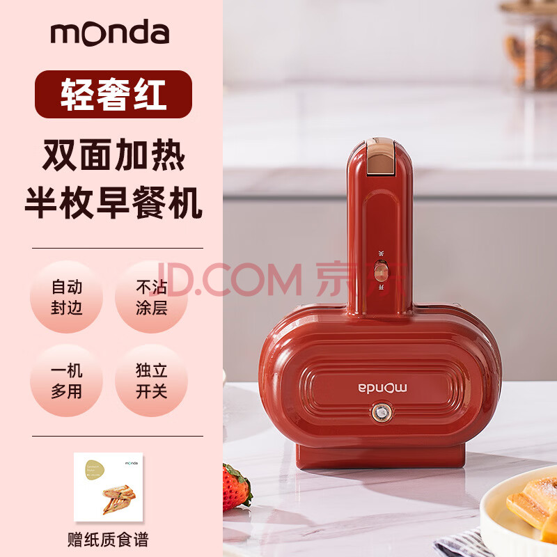蒙达(MONDA)电饼铛 半枚早餐机 家用小型早餐三明治机烤面包机 双面加热 多功能烙饼机 MD-SW6008轻奢红