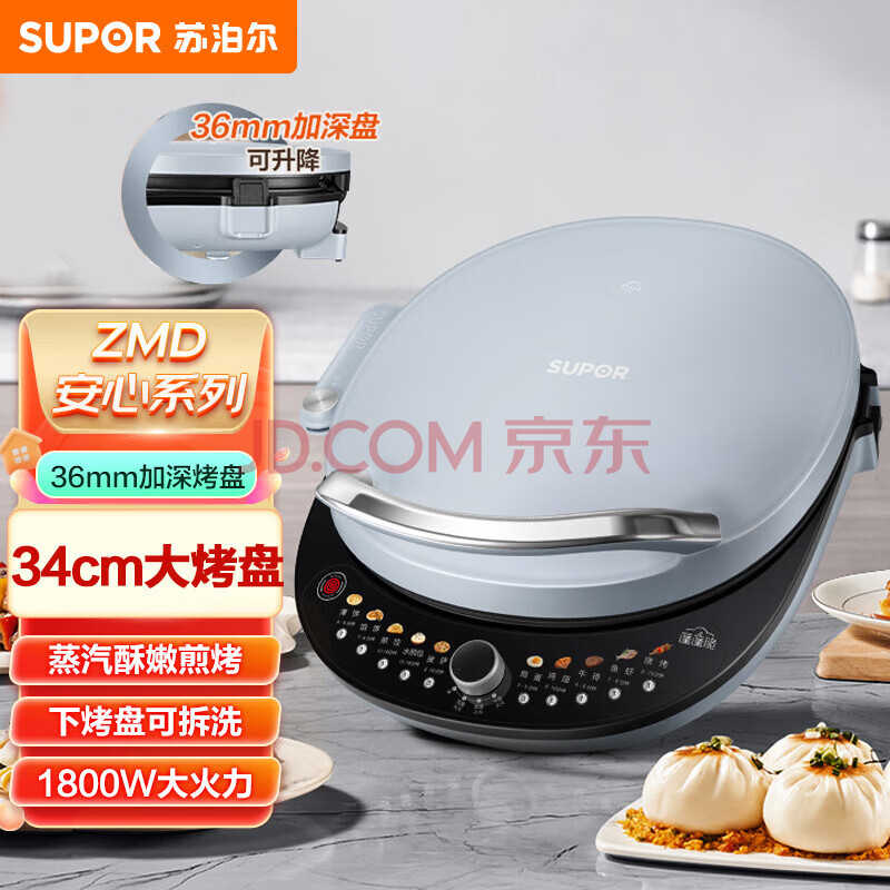苏泊尔(SUPOR)ZMD安心系列电饼档1800W大火力34cm大直径烤盘下盘可拆煎烤机JT34RQ17