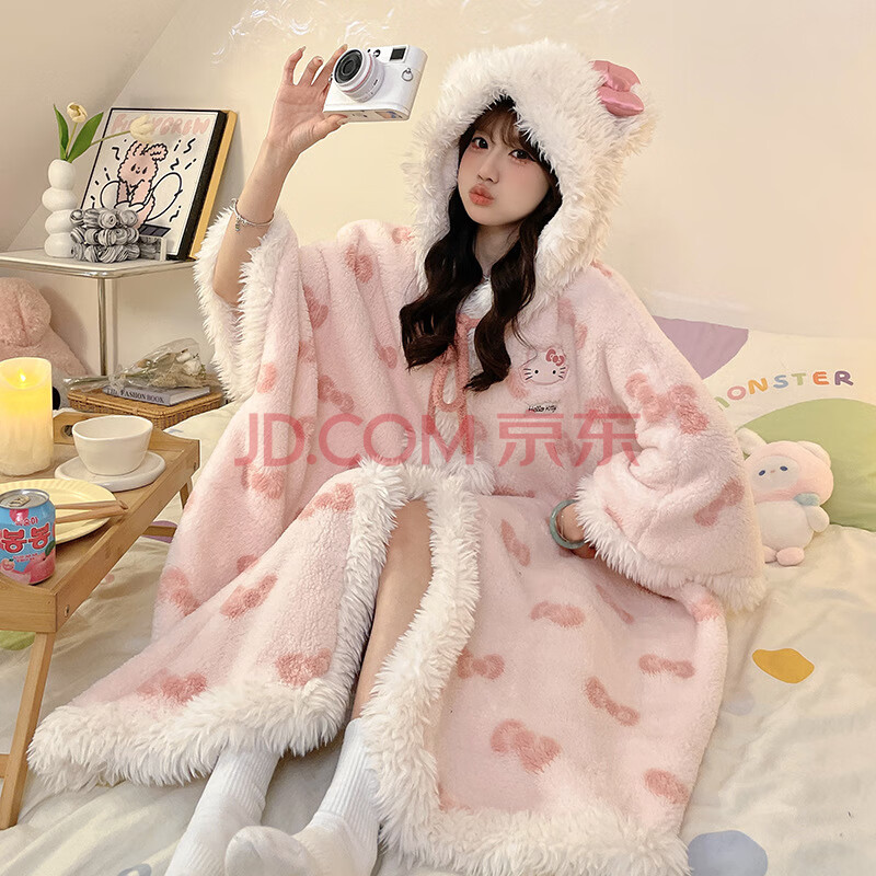 俞兆林(YUZHAOLIN)凯蒂猫奶呼呼睡衣女秋冬季珊瑚绒加绒加厚斗篷睡袍浴袍家居服套装
