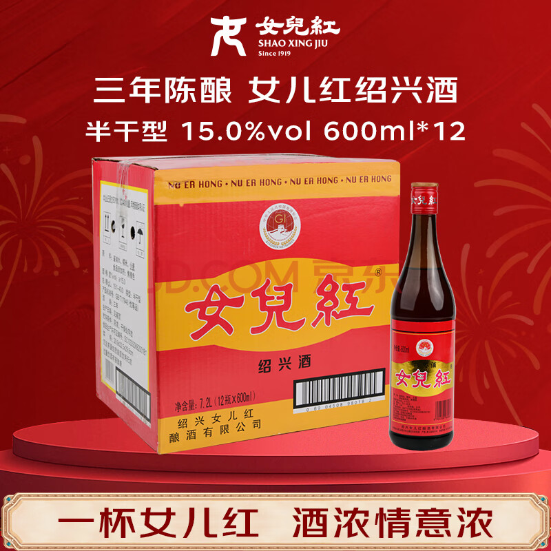 女兒红 陈年特酿 三年陈 半干型 绍兴黄酒 600ml*12瓶 整箱装 年货