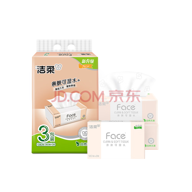 洁柔抽纸 粉Face可湿水3层120抽*3包 柔韧细滑 100%原生木浆面巾纸