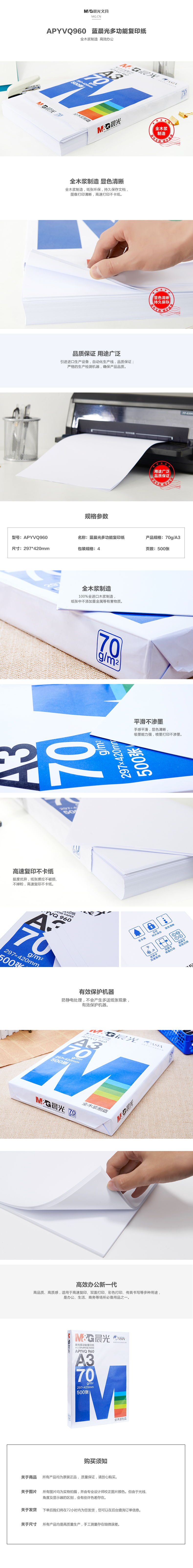 【4包装】晨光复印纸蓝晨光70gA3纸 500张/包 APYVR960B