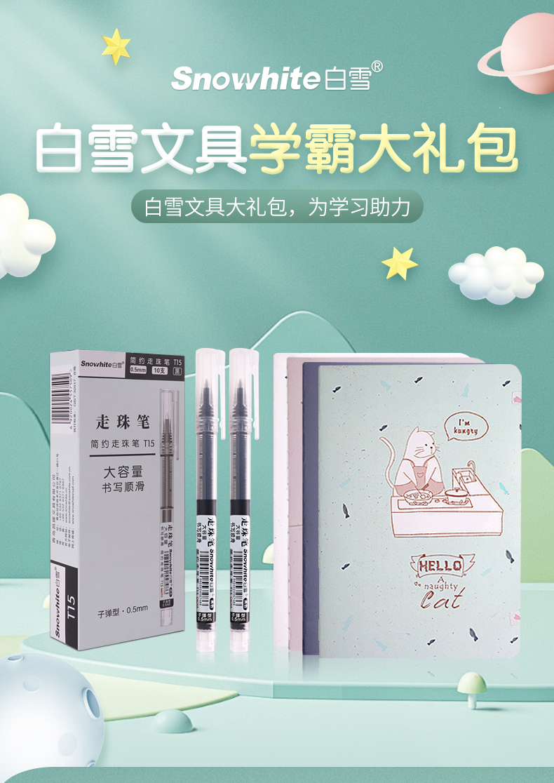 白雪文具10支速干子弹头直液式走珠笔+2本A5缝线本笔记本子组合中性笔速干签字笔学习文具