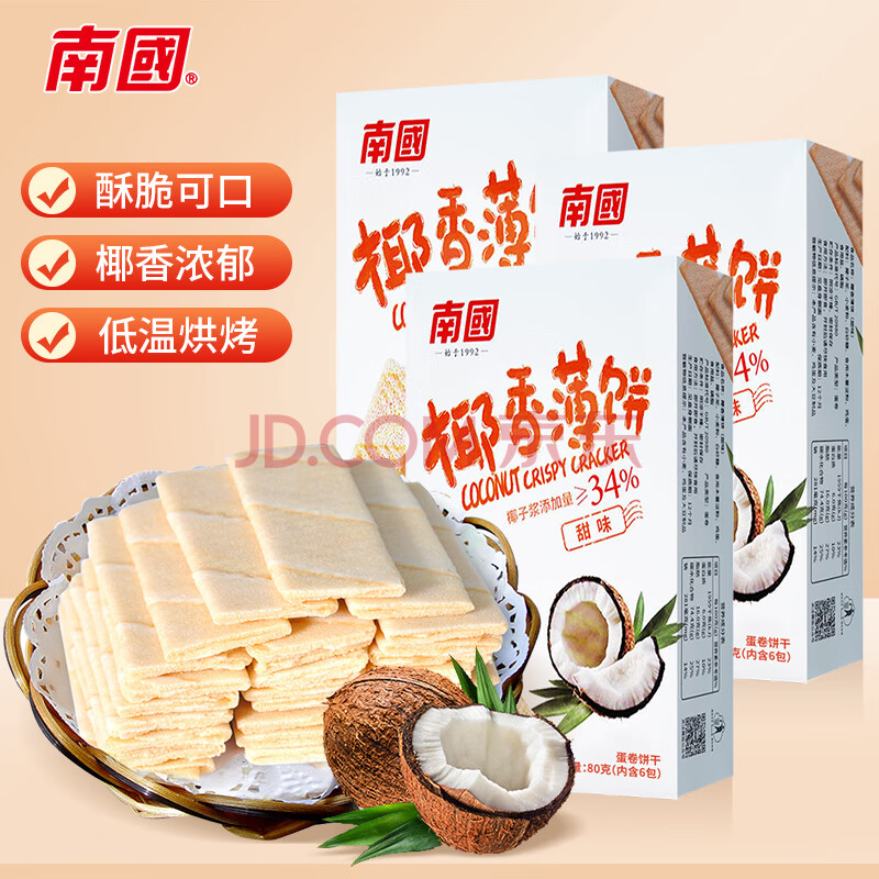 南国 椰香薄饼甜味80g*3盒 薄脆椰子饼干海南特产休闲零食独立包装