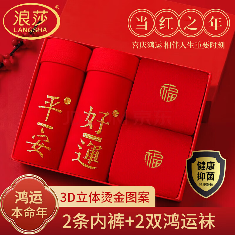 浪莎红色内裤男本命年马年男士纯棉10A抗菌喜庆结婚平角裤+红袜子男