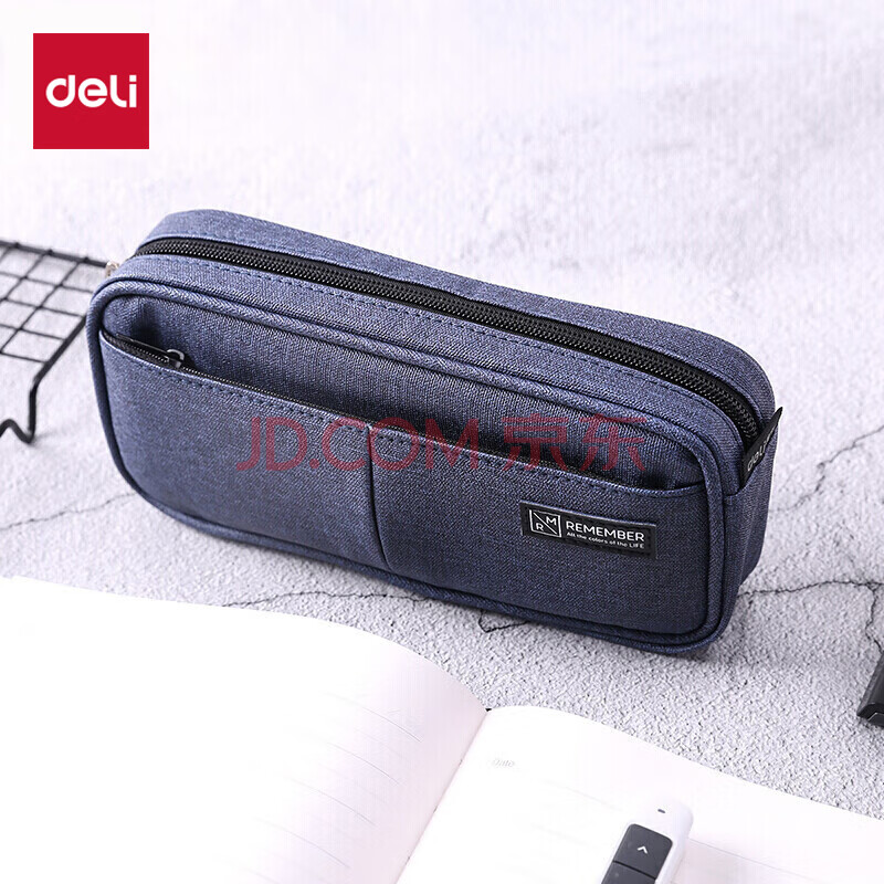 得力(deli)多层大容量笔袋 仿亚麻多功能文具盒 学生铅笔收纳袋/商务包 深蓝色开学必备