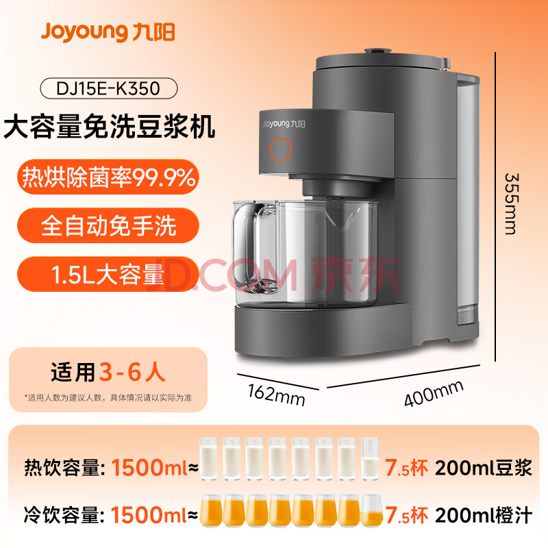 九阳(Joyoung)免手洗豆浆机1.5L大容量2-6人用 高速破壁轻松预约家用全自动破壁机榨汁机K350