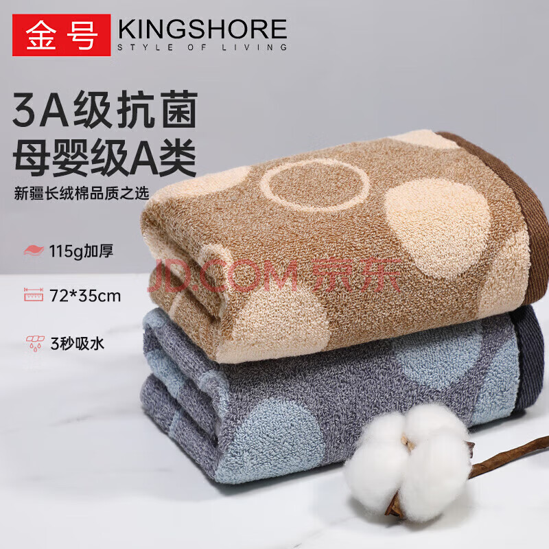 金号纯棉毛巾 115g 3A抗菌吸水加厚 A类全棉洗脸面巾2条72*35cm 棕+灰
