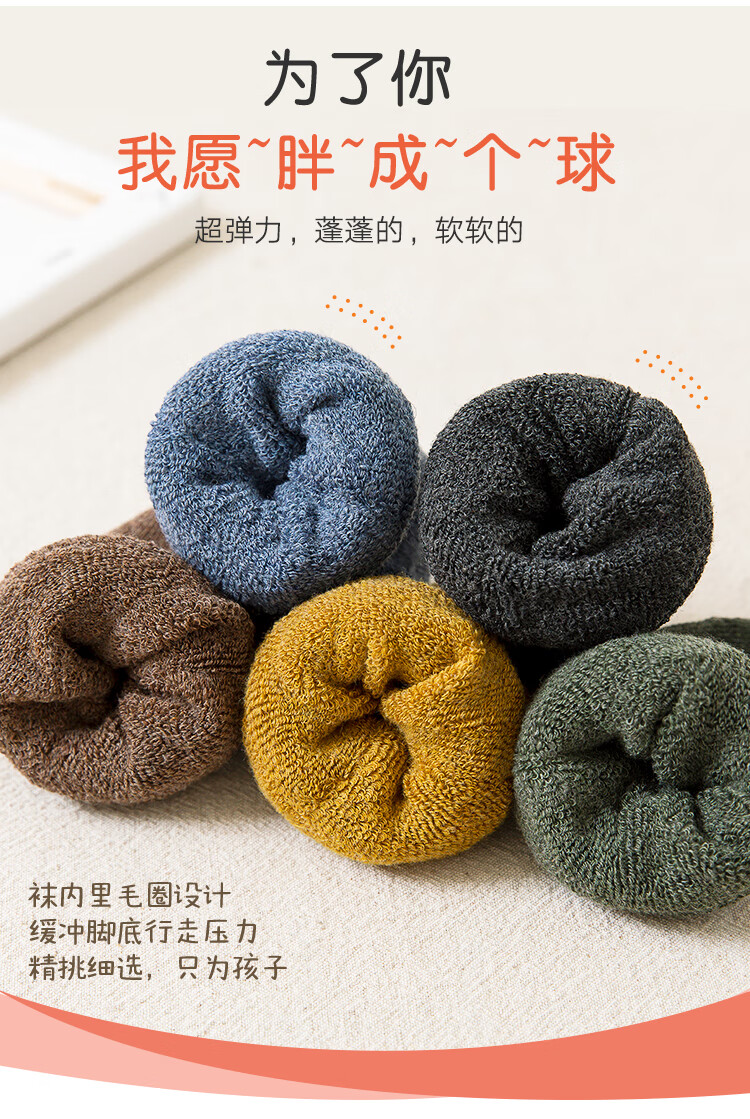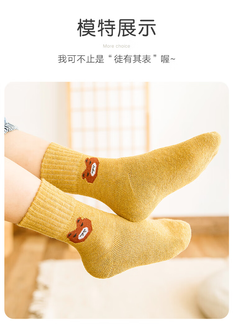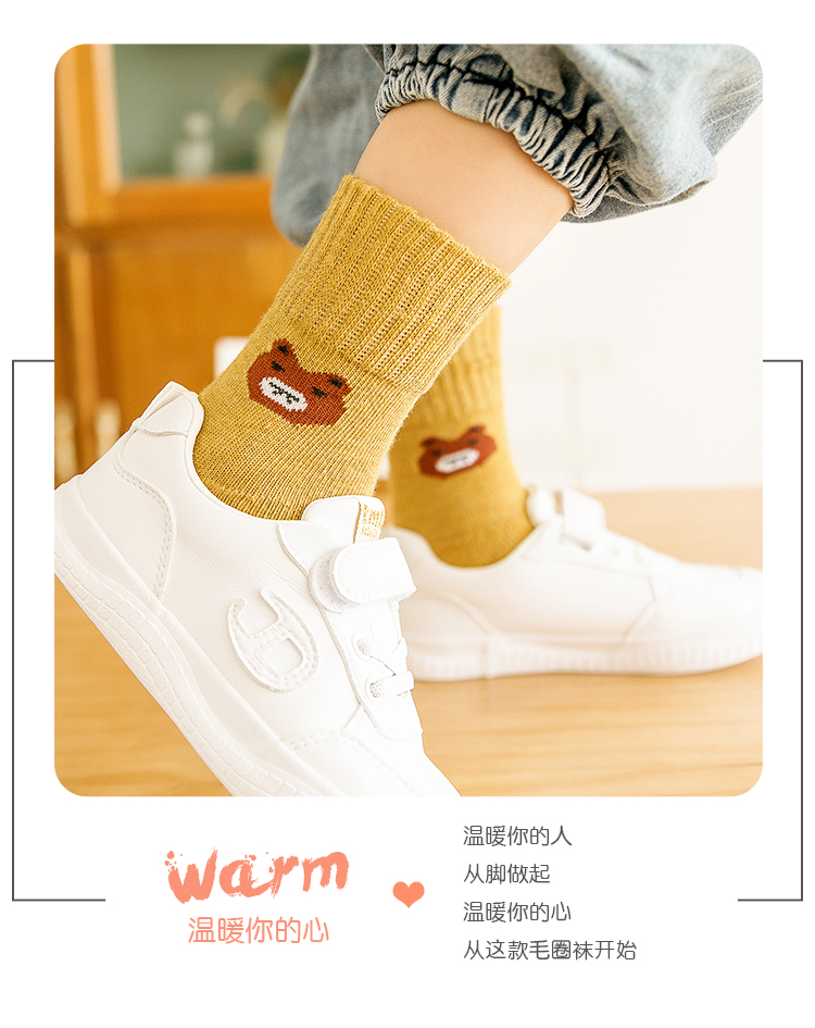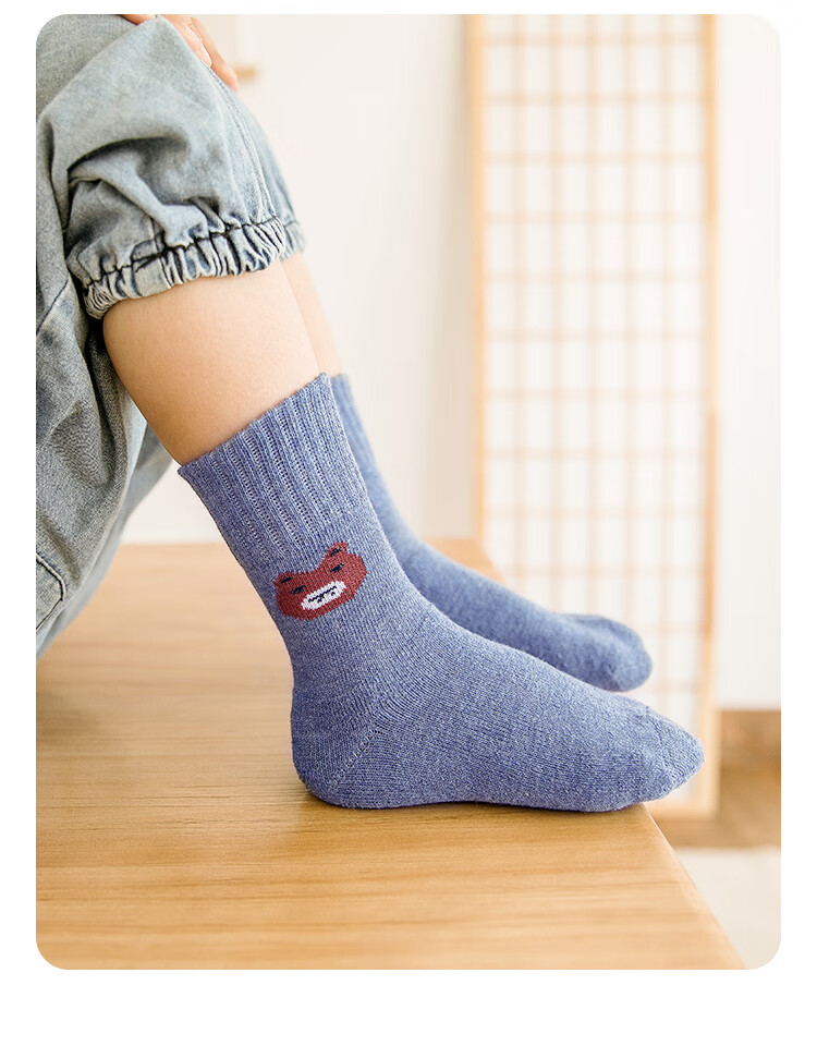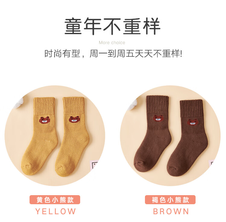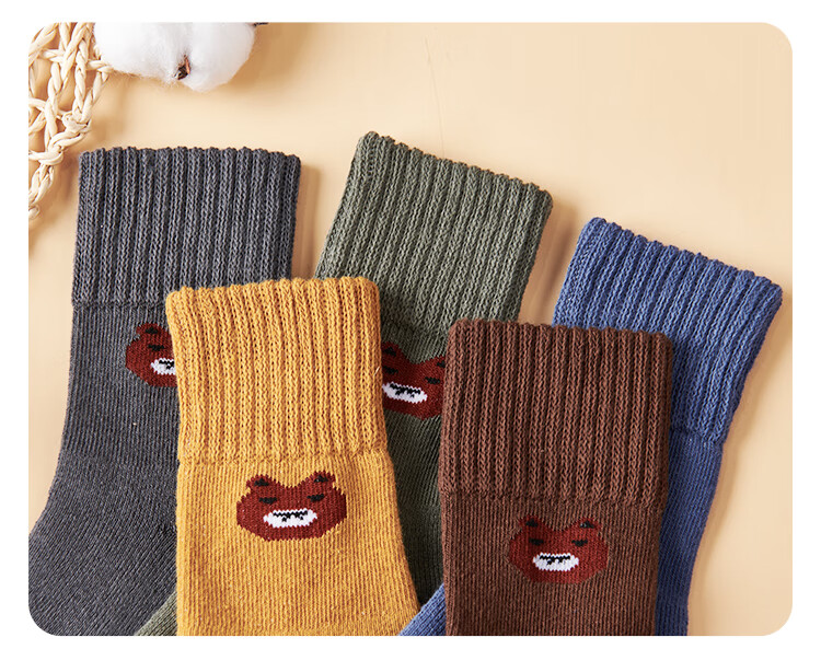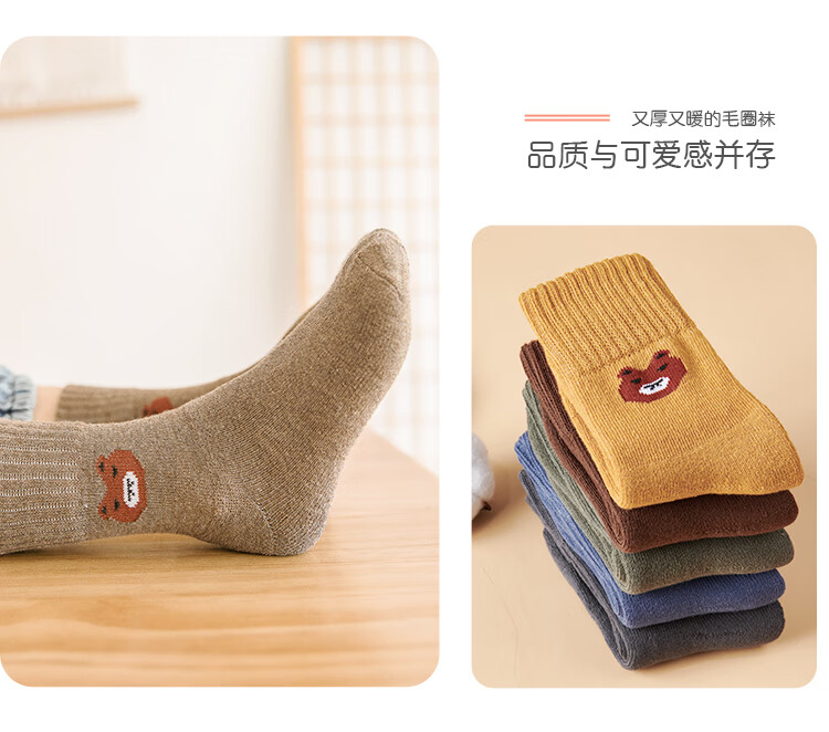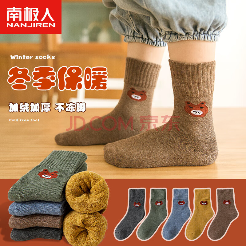 南极人儿童袜子男女童5双装中筒加厚毛圈袜儿童秋冬季棉袜可爱小熊L
