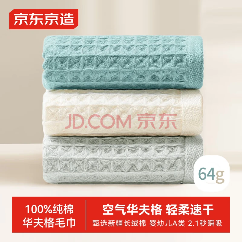 京东京造 轻柔速干华夫格毛巾 纯棉A类吸水长绒棉男女成人婴儿洗脸巾 3条