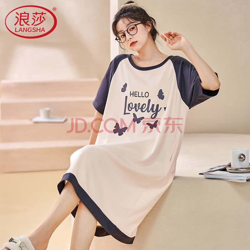 浪莎睡裙女夏天纯棉宽松夏季家居服夏季薄款大码睡衣 蝴蝶印花 L