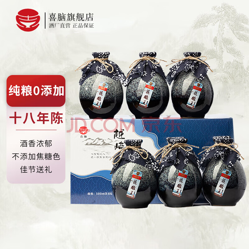 喜脑黄酒绍兴特产十八年陈酿花雕王无焦糖色坛装糯米酒整箱装送礼