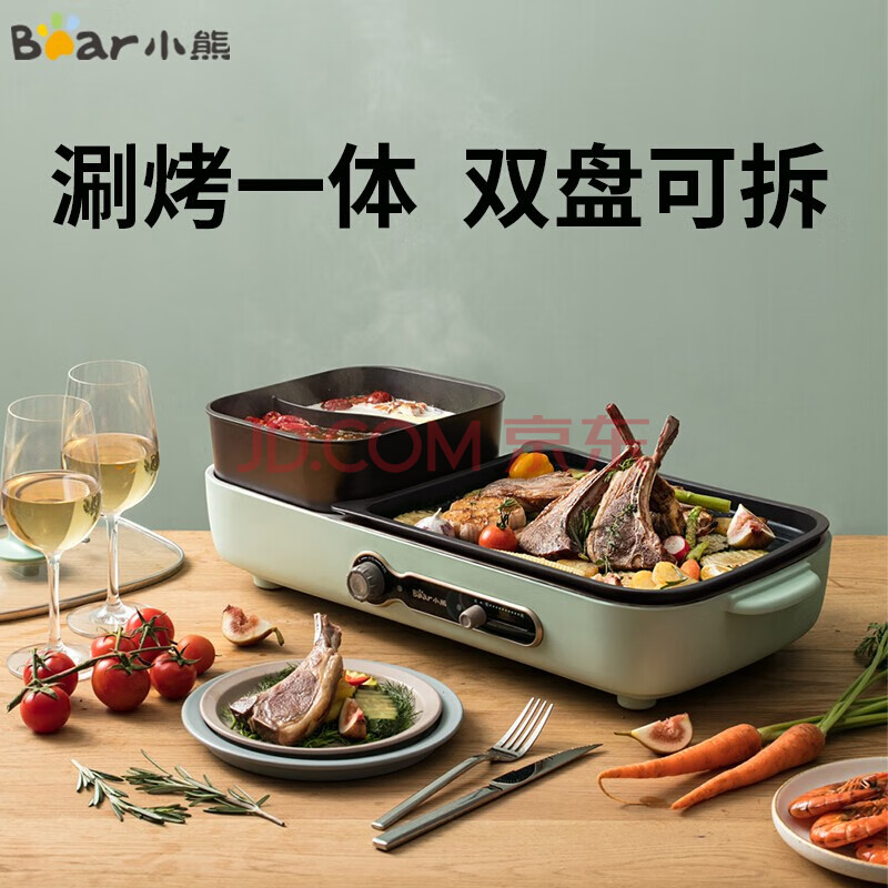 小熊(Bear)电烧烤炉 DKL-C16C1 绿色 3.4L 电烤炉家用多功能电火锅 可拆卸烤涮一体锅鸳鸯锅烤肉烧烤机