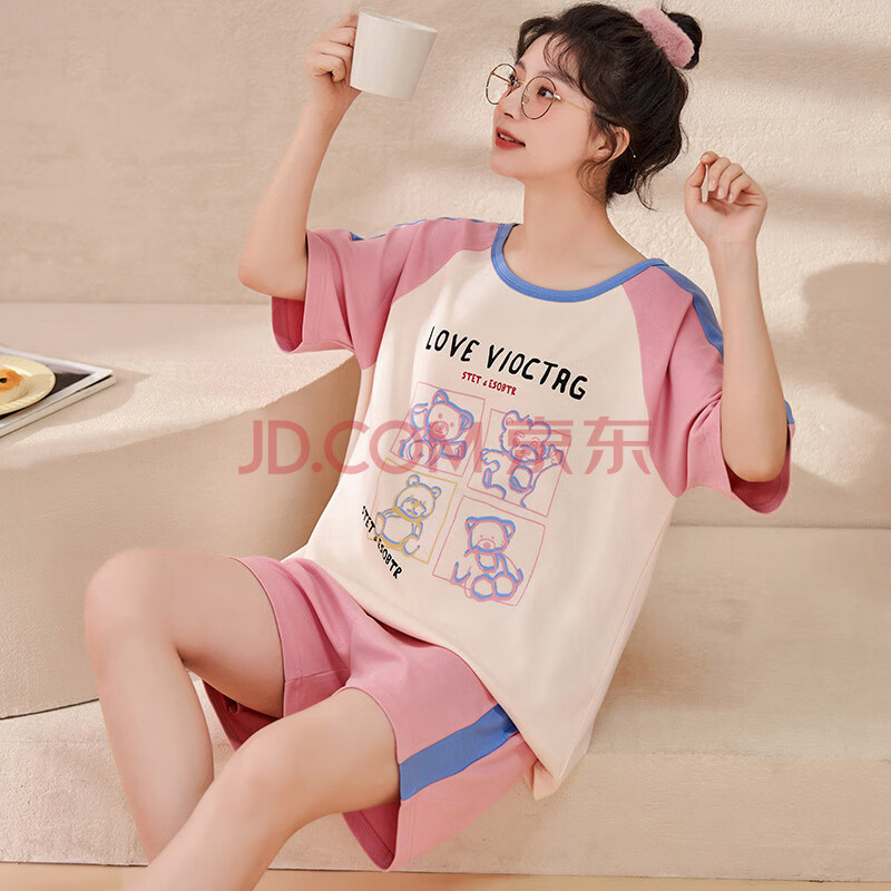 浪莎睡衣女夏天两件套装大码短袖短裤薄款纯棉家居服 软萌小熊 XXL