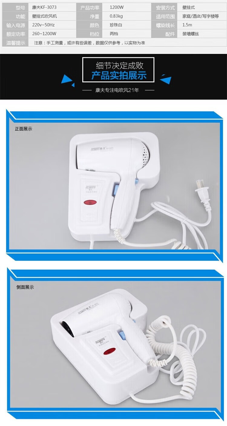 康夫(CONFU)电吹风酒店宾馆壁挂式浴室卫生间1200W专业冷热风大功率挂墙式免打孔KF-3073 商用