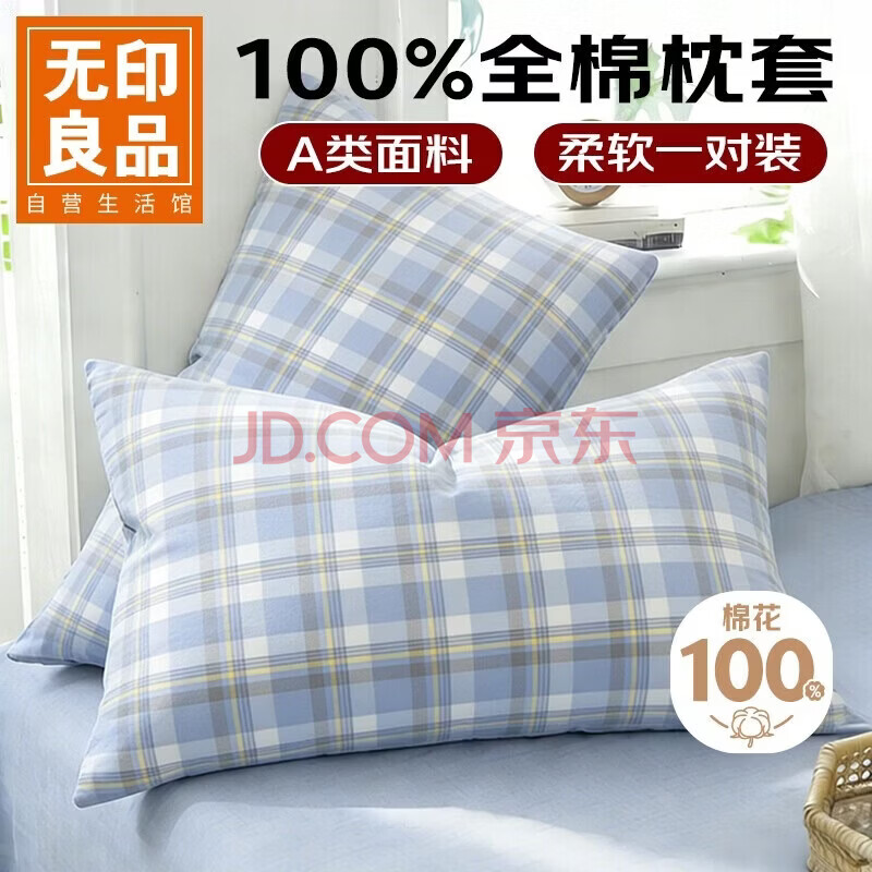无印良品A类全棉枕套100%纯棉枕头套枕芯套枕巾48x74cm对装 兰格