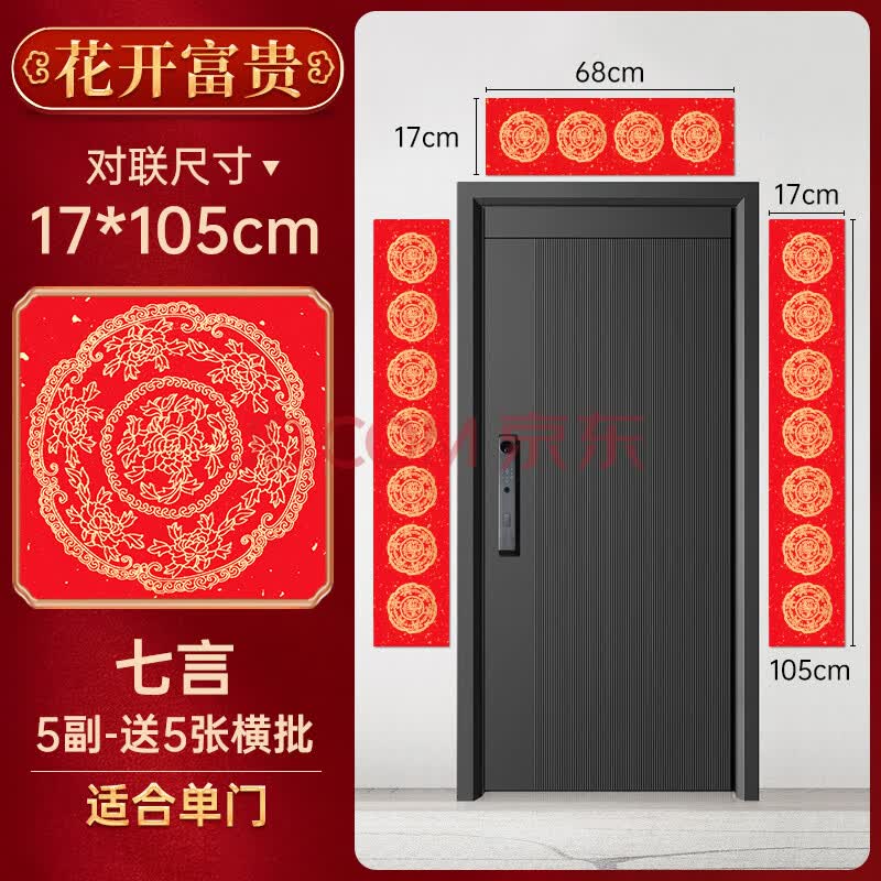 玉水湖万年红宣纸对联纸新年春联七言五言空白对联专用纸四尺四开洒金龙凤呈祥5副装 花开富贵7言105*17cm