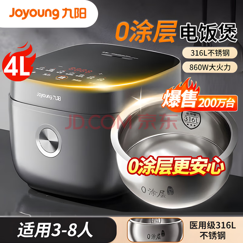 九阳(Joyoung)电饭煲【健康0涂层】316L不锈钢内胆 上蒸下煮 5A香糯柴火饭 24H智能预约 多功能4L大容量40F316L