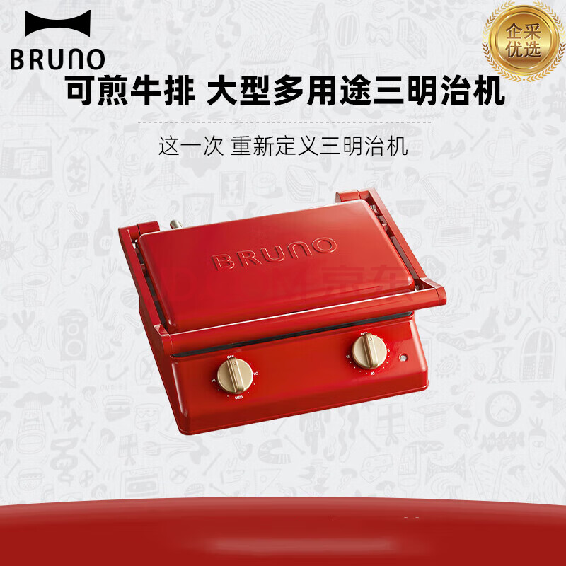 BRUNO三明治机 多功能家用大型双人复古烤肉 吐司早餐机双面压烤大容量 【企采购】/BOE084 复古红