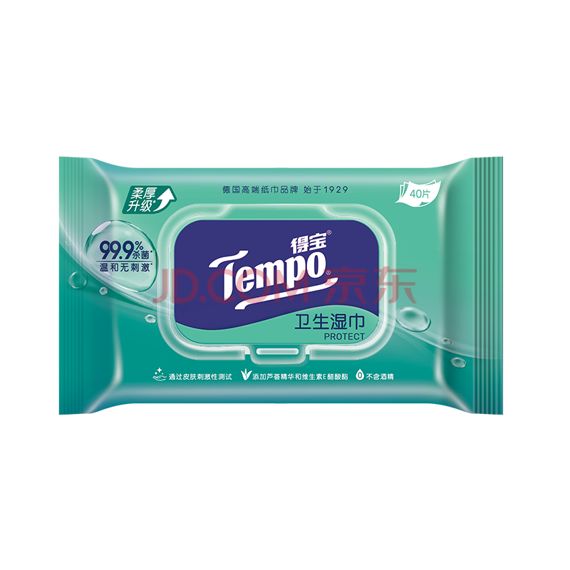 得宝 TEMPO杀菌湿巾 40片*1包 抽取式 温和不刺激 杀菌率99.9% 湿纸巾