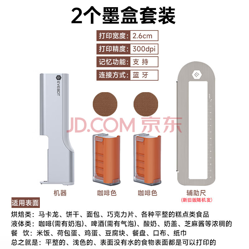 亿瓦(EVEBOT)手持食品打印机 美食咖啡拉花DIY文字图案可食用墨商务接待 打印机+2个咖啡色墨盒+辅助尺