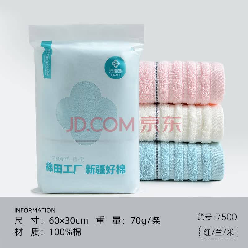 洁丽雅(Grace) 纯棉柔软全棉毛巾7500 60*30 70g/条袋装 10条起发