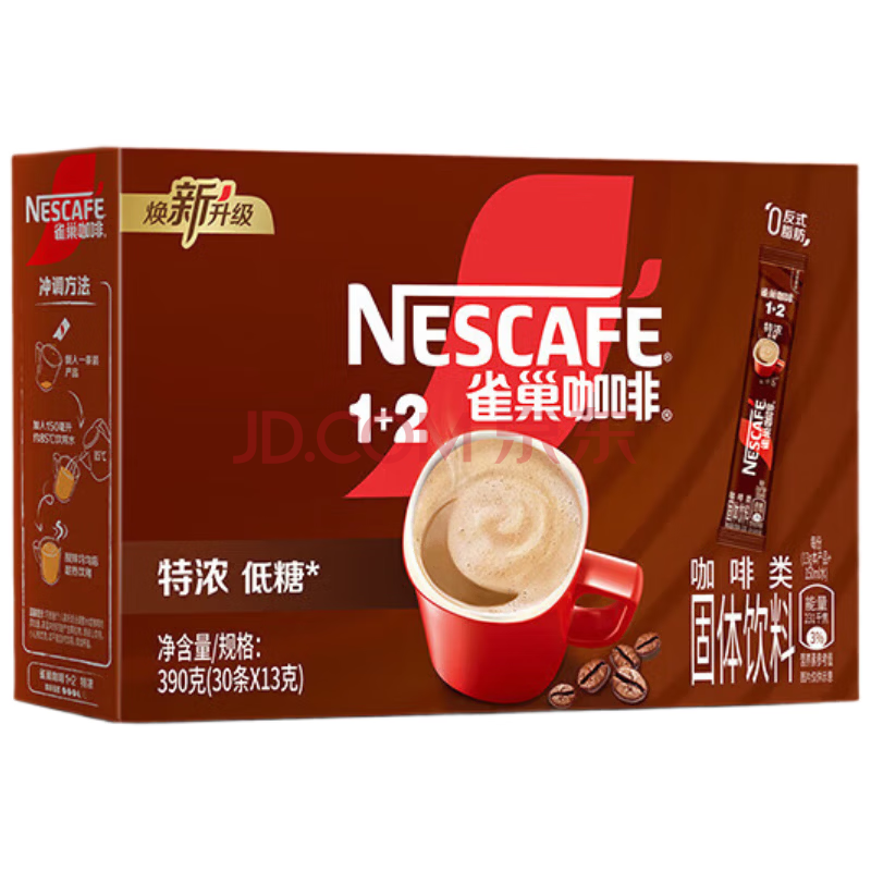 雀巢速溶咖啡1+2特浓低糖13g*30条装*3盒 双豆拼配条装三合一冲调饮品