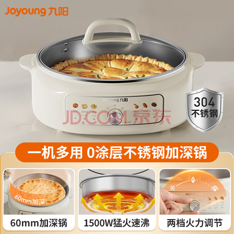 九阳(Joyoung)家用煎烤机304不锈钢0涂层内胆早餐机加深锅体电饼铛煎烤烙涮煮一体电炒锅JK30-GK339