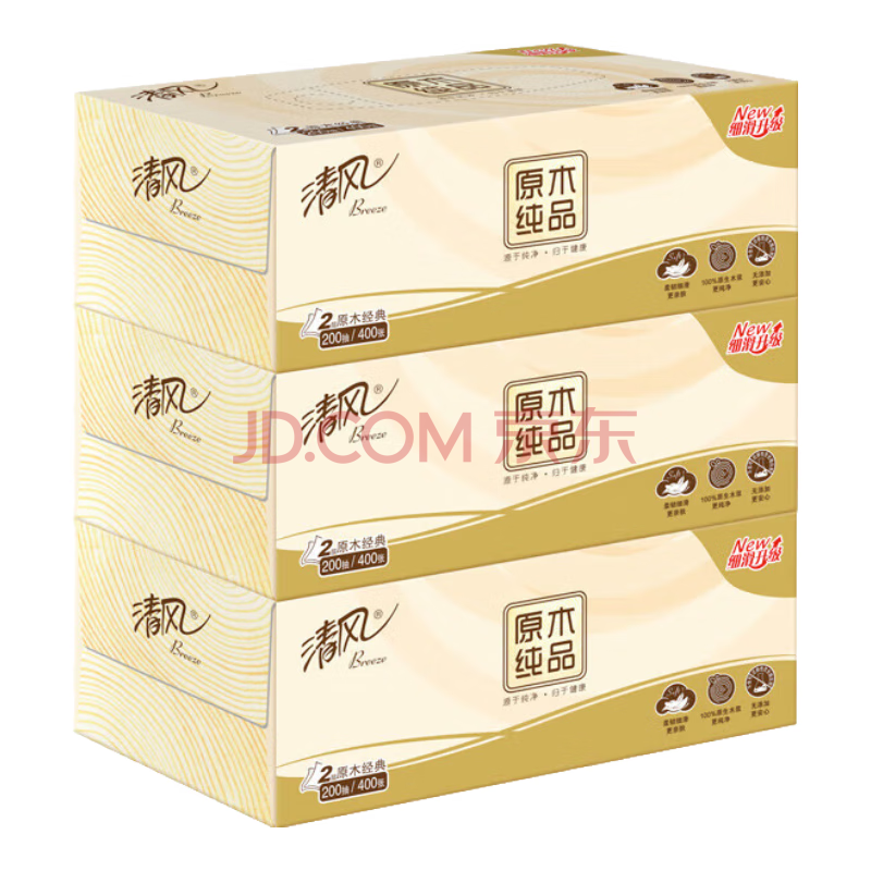 清风抽纸 原木纯品 2层200抽*3盒XL码 盒装抽纸 卫生纸 纸巾 餐巾纸