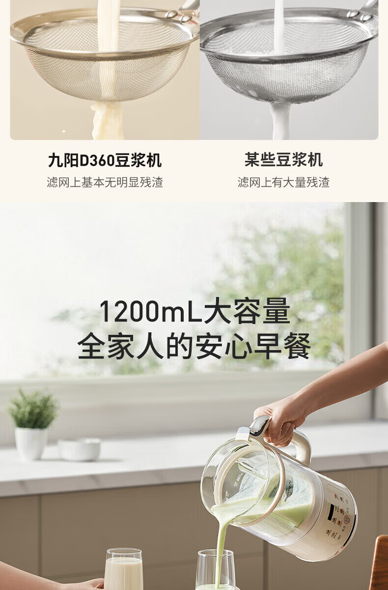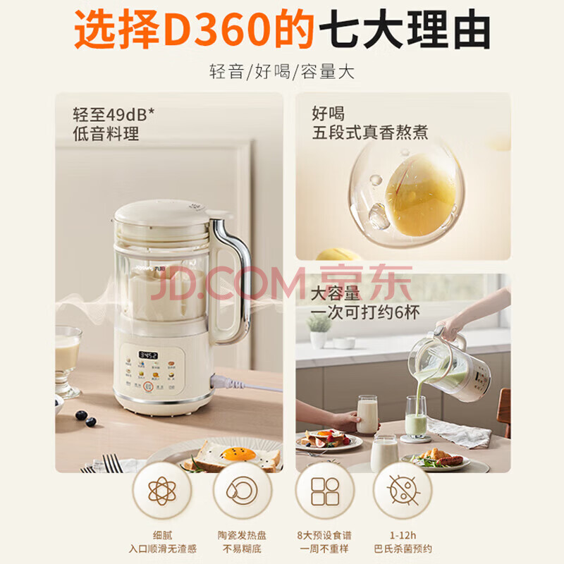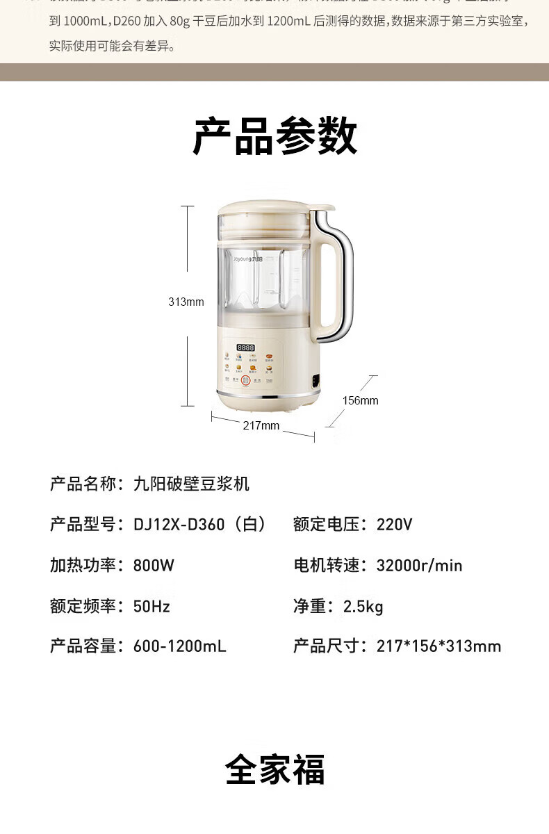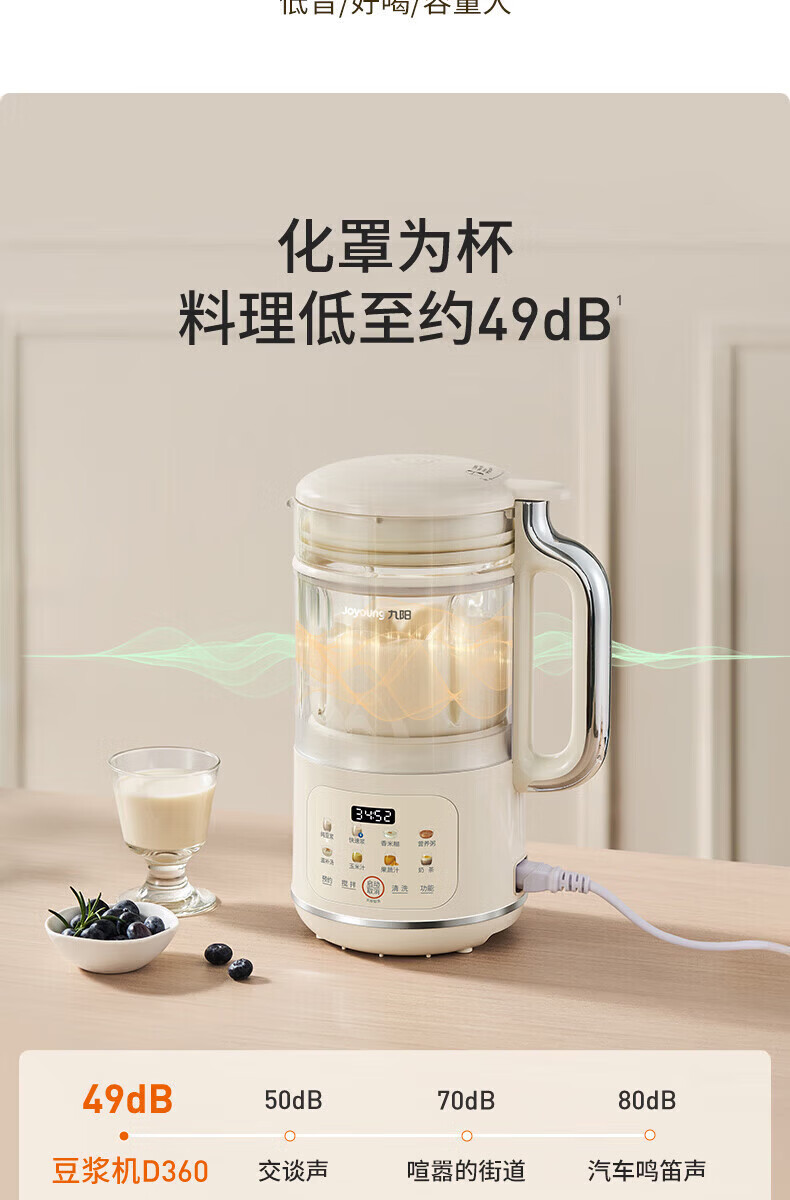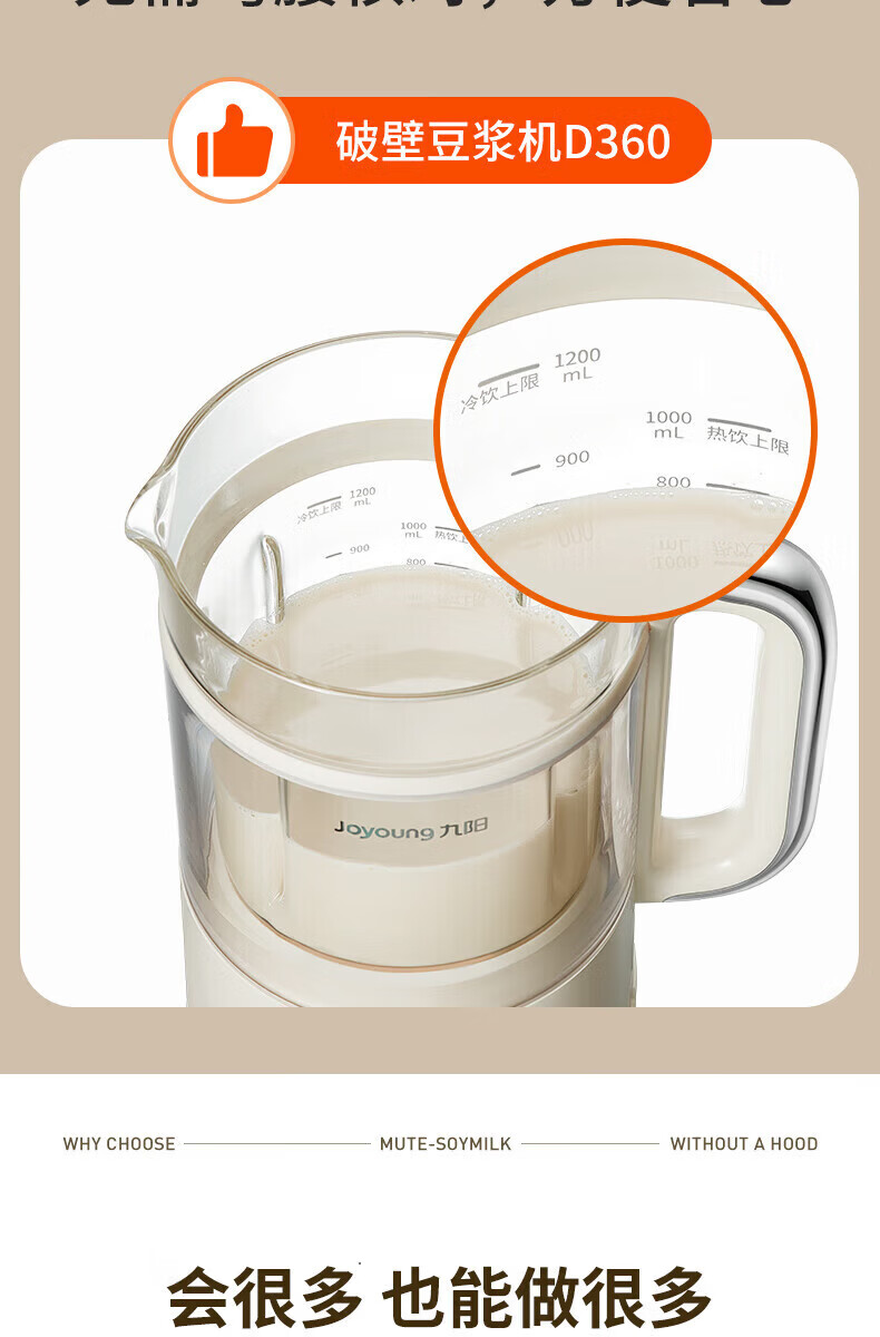 (JOYOUNG)九阳豆浆机1.2L轻音破壁机家用全自动降噪小型多功能免过滤免煮辅食机一键清洗料理机DJ12X-D360(白)