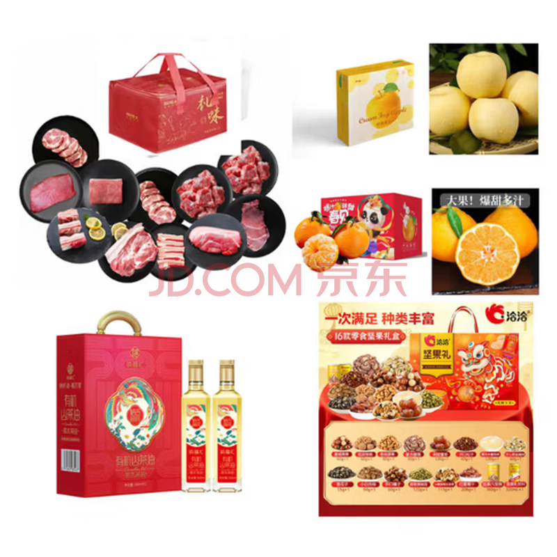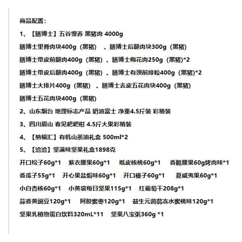1、【膳博士】五谷慢养 黑猪肉 4000g 膳博士里脊肉块400g(黑猪) 、膳博士后腿肉块300g(黑猪) 膳博士带皮前腿肉400g(黑猪) 、膳博士梅花肉250g(黑猪)*2 膳博士带皮后腿肉400g(黑猪) 、膳博士有颈前排粒400g(黑猪)*2 膳博士大排片400g(黑猪) 、膳博士去皮五花肉块400g(黑猪) 膳博士五花肉块400g(黑猪) 2、山东烟台 地理标志产品 奶油富士 净重4.5斤装 彩箱装 3、四川眉山 春见耙耙柑 4.5斤大果彩箱装 4、【纳福汇】有机山茶油礼盒 500ml*2 5、【洽洽】坚满味坚果礼盒1898g 开口松子60g、开心果盐焗味60g、紫衣腰果60g、开口榛子60g、纸皮核桃60g夏威夷果60g、香脆腰果60g、小白杏核60g、香瓜子55g、小黄袋每日坚果115g、红葡萄干208g、蒜香黄豌豆120g、阿胶蜜枣120g、益生元果冻水蜜桃味120g、坚果乳320ml、坚果八宝粥360g