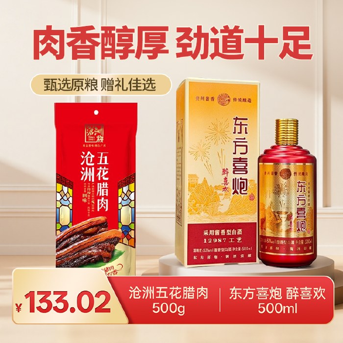 【特惠组合】500g沧洲五花腊肉 + 东方喜炮 醉喜欢 53度酱香型白酒 500ml 单瓶礼盒装