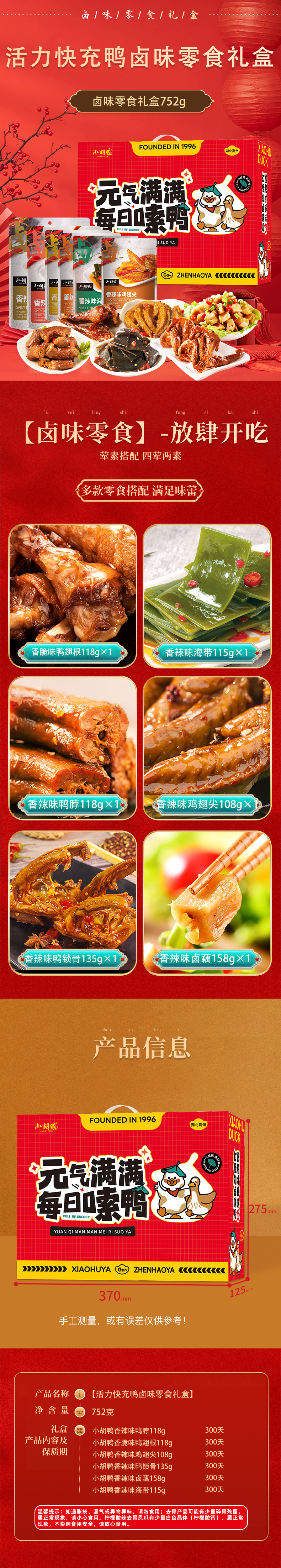 小胡鸭-活力快充鸭卤味零食礼盒752g 卤味香辣鸭脖鸭锁骨鸭翅肉类零食礼包