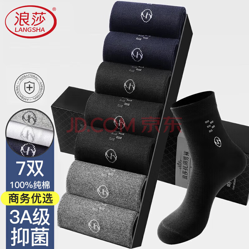浪莎袜子男7双中筒100%全棉纯棉抑菌春秋冬季防臭棉袜黑色男士长袜
