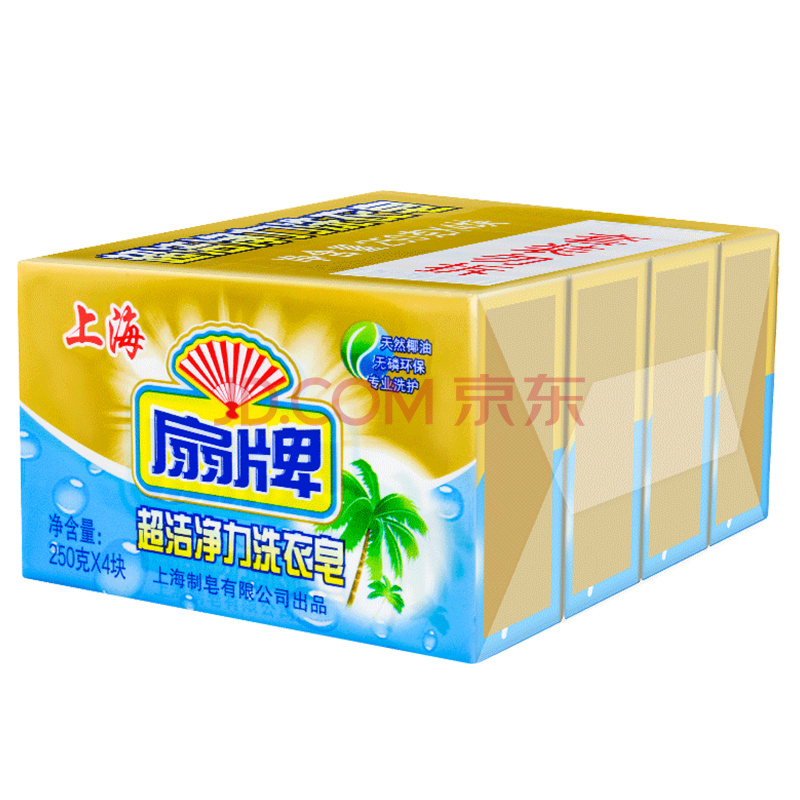品牌:扇牌 产品规格:250g*4 保质期: 3年 产品功效:扇牌洗衣皂用料考究,确保了皂体的晶莹剔透,不伤皮肤。 产地:中国 适用范围:适用各类衣物,洗涤安心。