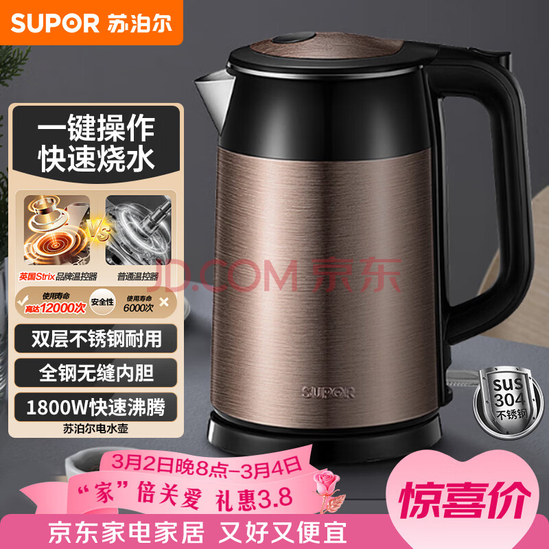 苏泊尔(SUPOR)电水壶 双层防烫烧水壶热水壶1.7L大容量 全钢无缝内胆304不锈钢电热水壶SW-17J419