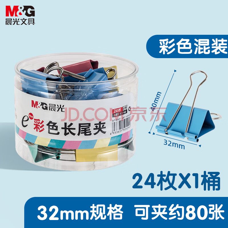 晨光(M&G)文具热门商品3#32mm 24只/罐 彩色长尾夹 中号金属票据夹 Eplus系列办公燕尾夹 ABS92740