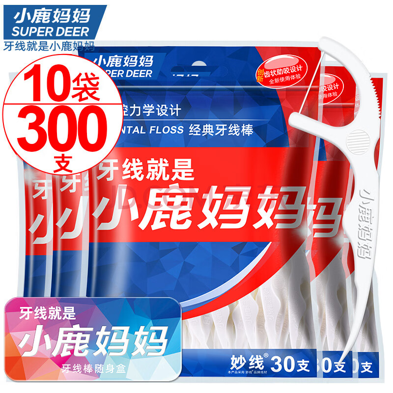 小鹿妈妈经典牙线棒细滑牙线牙签30支/袋*10袋 共300支 随身盒 方便携带