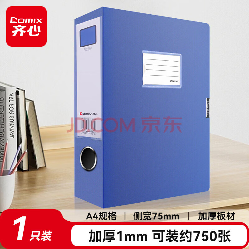 齐心(COMIX)75mm档案盒 A4文件盒 加厚型粘扣资料盒 蓝色 办公文具