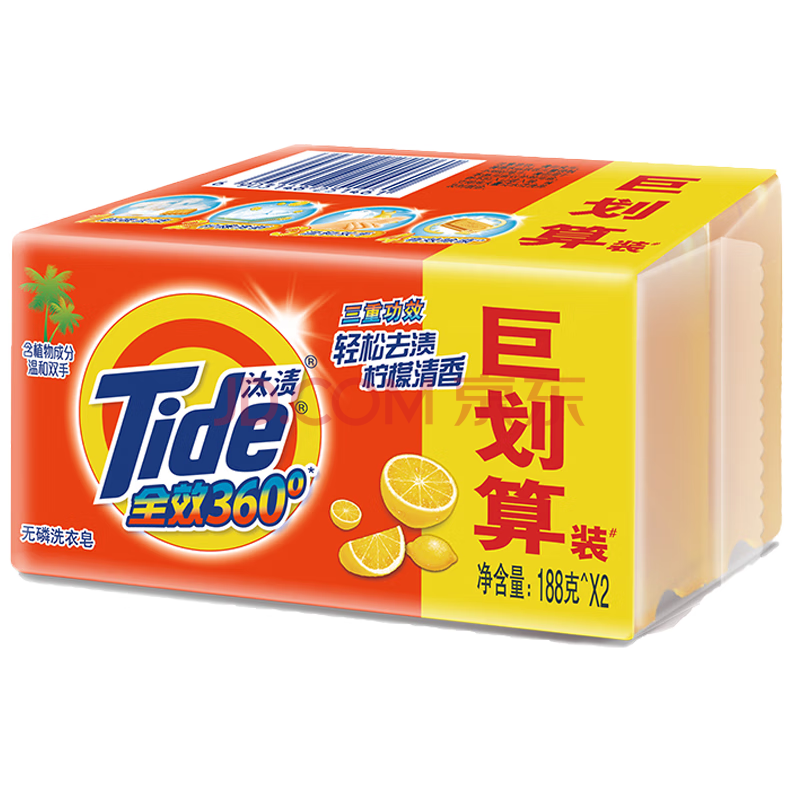 汰渍全效洁净洗衣皂柠檬188g*2块 温和去渍不伤手 肥皂透明皂